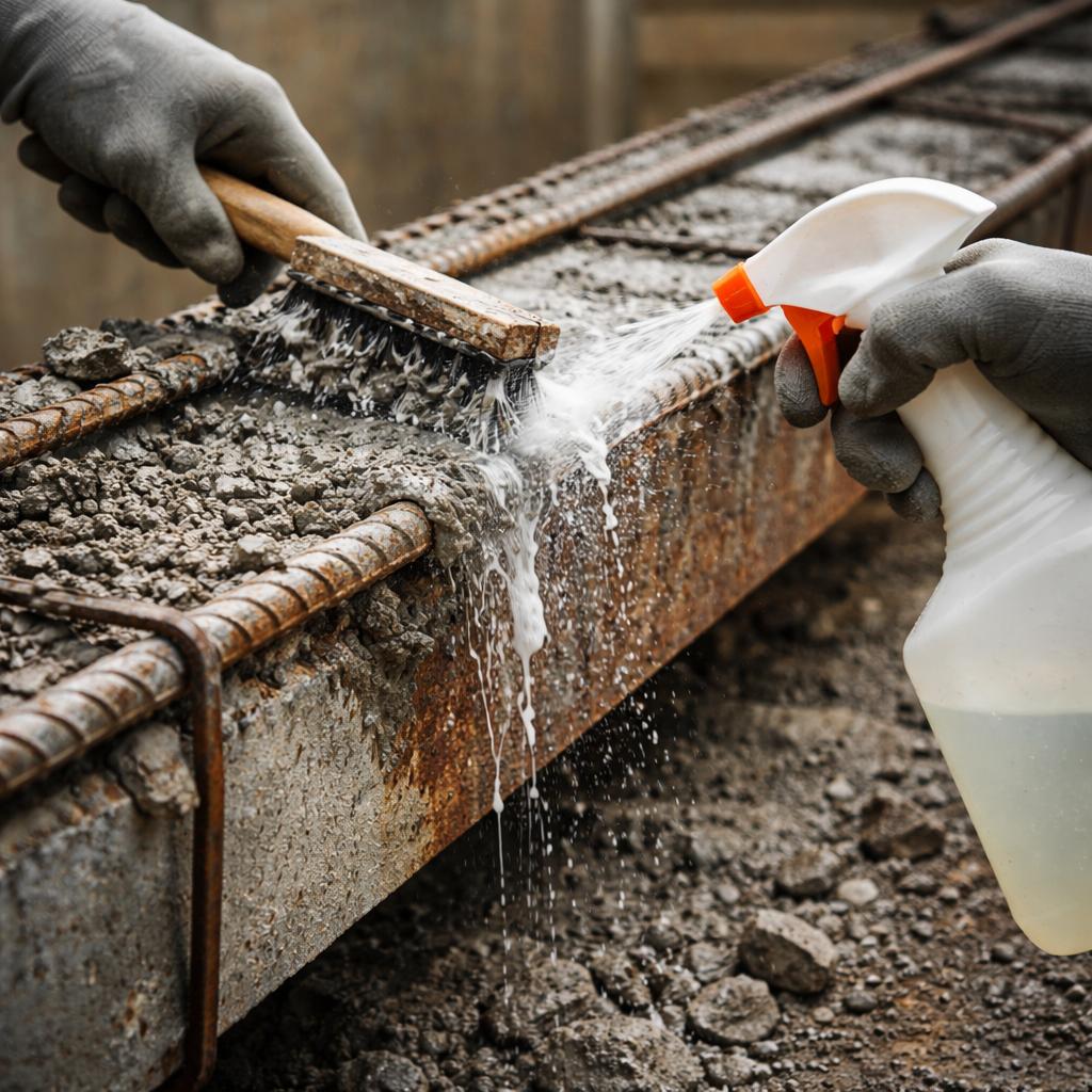 Химические методы очистки бетона от металла включают использование кислотных растворов или специализированных средств для удаления цементных пятен. Они эффективны при удалении бетона, который прочно прикрепился к металлу и с которым не справляются механические способы.