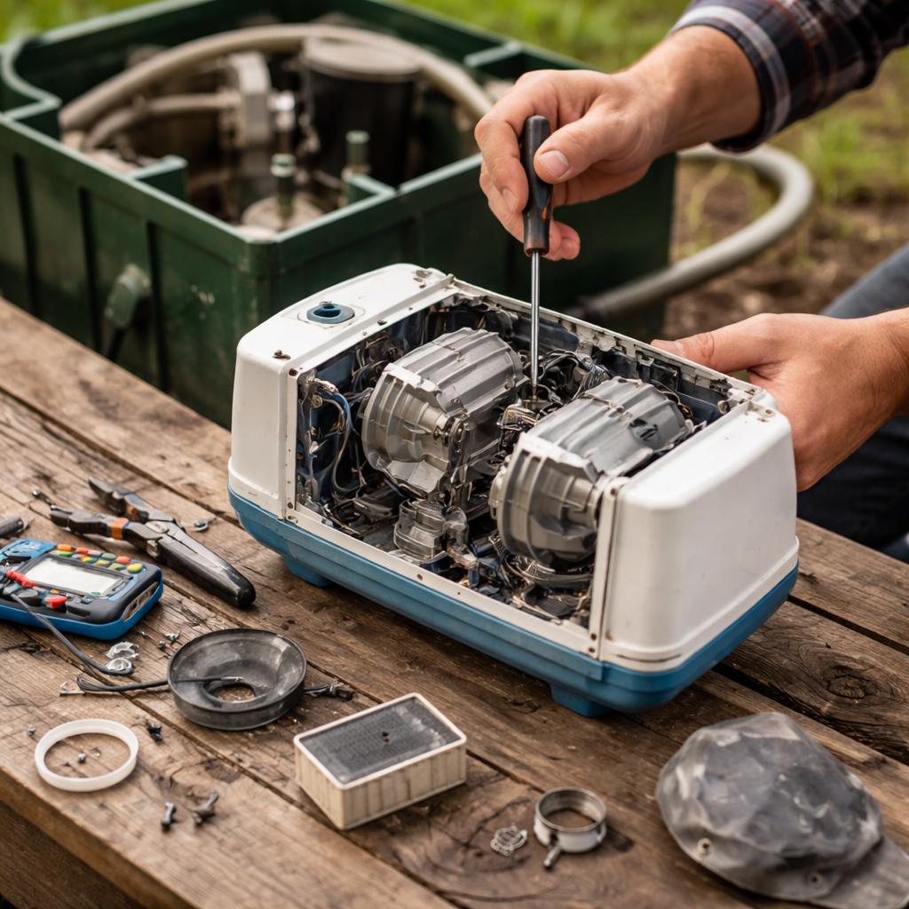 Ремонт компрессора для септика своими руками может быть достаточно простым или же более сложным, в зависимости от характера поломки. Рассмотрим несколько типовых сценариев, с которыми могут столкнуться владельцы септиков.