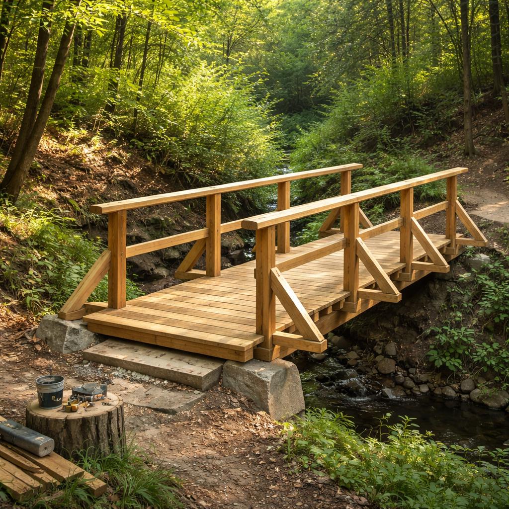 - Дерево — доступный и природный материал, подходит для несложных конструкций и лёгких мостов.