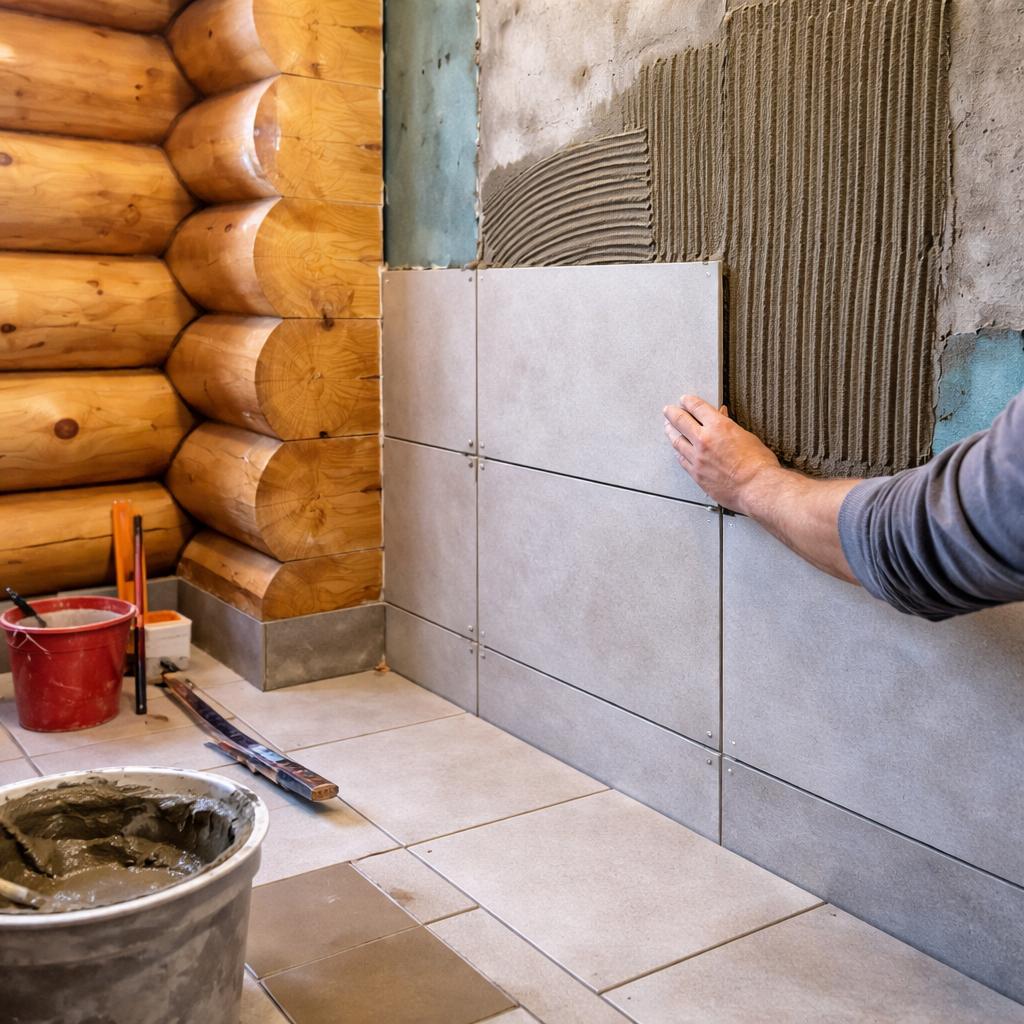В срубе плитку не размещают напрямую на брёвнах или брусе. Между древесиной и плиточным слоем всегда создаётся промежуточная конструкция, способная компенсировать движение.
