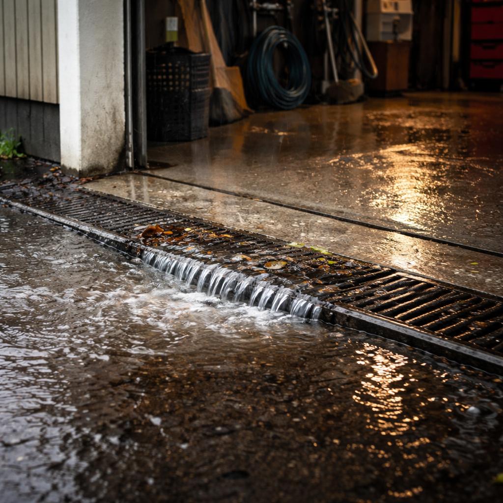 Особенность гаража в том, что вода здесь не «растворяется» по участку. Она либо уходит организованно, либо остаётся у основания стен. Поэтому любые сбои в отводе проявляются быстро и заметно: лужи перед въездом, мокрый порог, следы подтеков на стенах, запах сырости внутри.