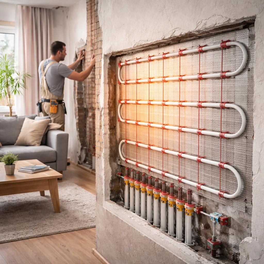 Основной принцип работы теплых водяных стен заключается в том, что стены помещения оснащаются специальными трубопроводами, по которым циркулирует горячая вода. Эта вода нагревает поверхность стены, которая, в свою очередь, отдаёт тепло в пространство. Такая система работает по аналогии с отоплением пола, но, в отличие от последнего, тепло отдаётся в вертикальной плоскости. Теплые водяные стены становятся источником мягкого тепла, которое равномерно распределяется по помещению. Система в целом работает эффективно при низких температурах в помещении, что делает её хорошим выбором для жилых и рабочих пространств.